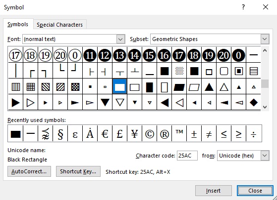 TYPING BLACK RECTANGLE SYMBOL/EMOJI USING INSERT SYMBOL DIALOG BOX (WORD, EXCEL, POWERPOINT)