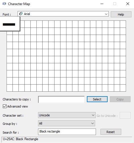 - You should now see the black rectangle symbol/emoji on the character map dialog. If you can’t see it, then you should look through the library of symbols to spot it. When found, double-click it to select/