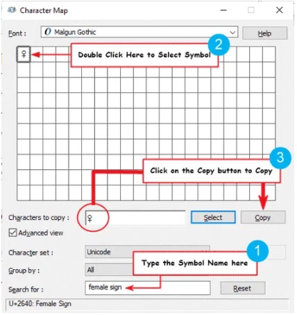 For windows users, obey the following instructions to copy and paste the female sign emoji using the character map dialog box.